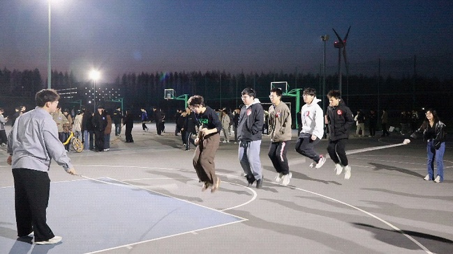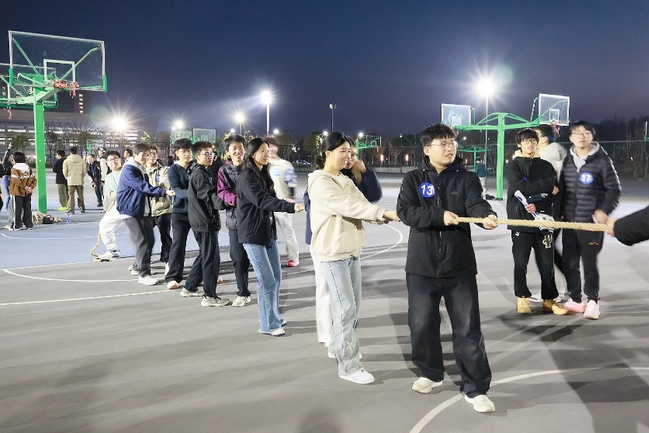 比赛共设置了四个趣味项目:“合形合拍”“气运联盟”“团队跳绳接力”和“男女拔河赛”。在“合形合拍”中,同学们通过身体协作拼出指定字母,创意与默契并存;“气运联盟”考验了队员间的配合与耐心,背靠背夹气球接力引得现场笑声不断;“团队跳绳接力”更是将比赛推向高潮,摇绳与跳跃的完美配合赢得了阵阵掌声;最后的“男女拔河赛”则展现了力量与策略的较量,各班啦啦队的助威声此起彼伏。