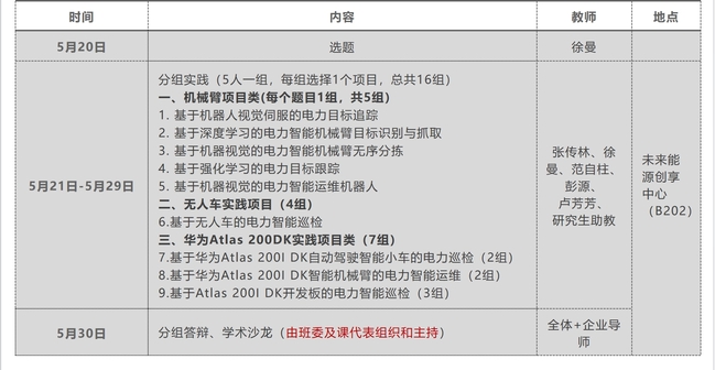 本次选题采用“软件+硬件+AI+能源电力”结合的模式。在前序课程《人工智能技术及电力系统应用》中,员工已经分组开展初步实践,实现了“AI+电力”的软件设计或相关算法,在此次课程中所有选题均增加“硬件”模块。根据硬件的类别,分为机械臂项目类、Appolo无人车类、华为开发板类三大类,其在能源电力场景的应用包括电力智能巡检系统、电力智能运维系统两大类,三类硬件九个实践题目,覆盖两大能源电力应用场景。