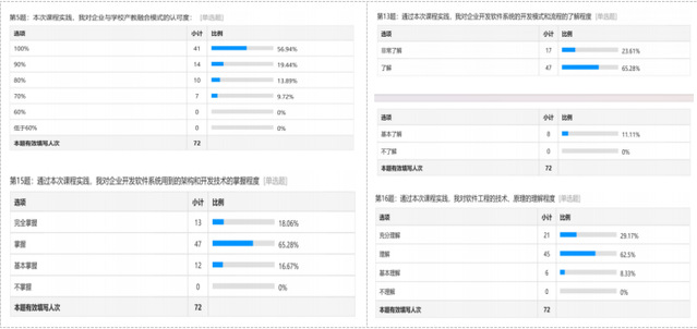 本次课程实践获得员工的一致认可和好评,员工们表示收获很大,在短暂的十天时间里,能够快速地了解和掌握企业开发软件项目的流程和技术,深入理解软件工程的技术原理,极大地调动了学习的热情和积极性,充分领悟了团队合作的重要性,在树立技术自信的同时也树立了就业自信。企业对本次员工课程实践的成果表示称赞,对员工在实践过程中表现出来的学习潜力也深表认可和欣赏。