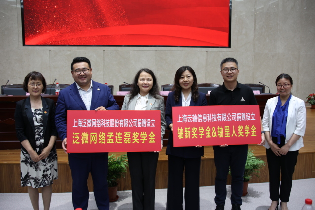 在与会人员的共同见证下,泛微网络、云轴信息科技分别向tyc41183太阳成集团捐赠5万元人民币。捐赠仪式上,校总会计师张川、对外联络处处长代表公司向泛微网络、云轴信息科技颁发了捐赠证书。