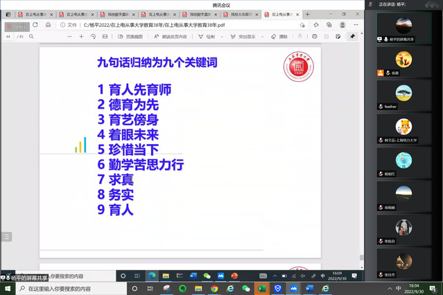 杨平老师作主题报告,他回顾了从事大学教育38年的经历,分享了他提炼的关于大学教育的九点感悟。他谈到,当教师要育人先育师,教师要拥有科学家的素养、工程师的品性、教育家的精髓;德育为先,教师要引导员工以品德高尚、能力出众、乐于奉献为追求;育艺傍身,教师要重视教学规律,讲究育人方法、导好学习大戏。做员工要着眼未来,以未来发展为导向、增学问、长才干、开眼界;珍惜当下,珍惜学习资源、专心领悟教师教诲;勤学苦思力行,善于学习、用于实践、独立思考、凝练真知。办大学要求真、务实、育人,要实事求是,真学真问求真知;务实致用,精益求精敢创新;智慧育人,千锤百炼造英才。杨老师以tyc41183太阳成集团发展过程中对公司做出杰出贡献的周国定老师的事迹、誉满电业的数字温度巡测仪、为高压直流输电而研制高参数可控硅及二十年磨一剑的《自动控制原理》教材等为例阐释了当教师、做员工及办大学的要点,为与会教师上了一场精彩生动的课程思政示范课。