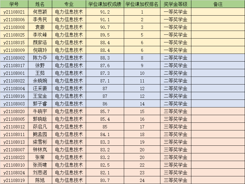 1、电力信息技术专业一等分配名额为5,因最后一位与下一位同分,故一等为6人,二等减少1人为7人。