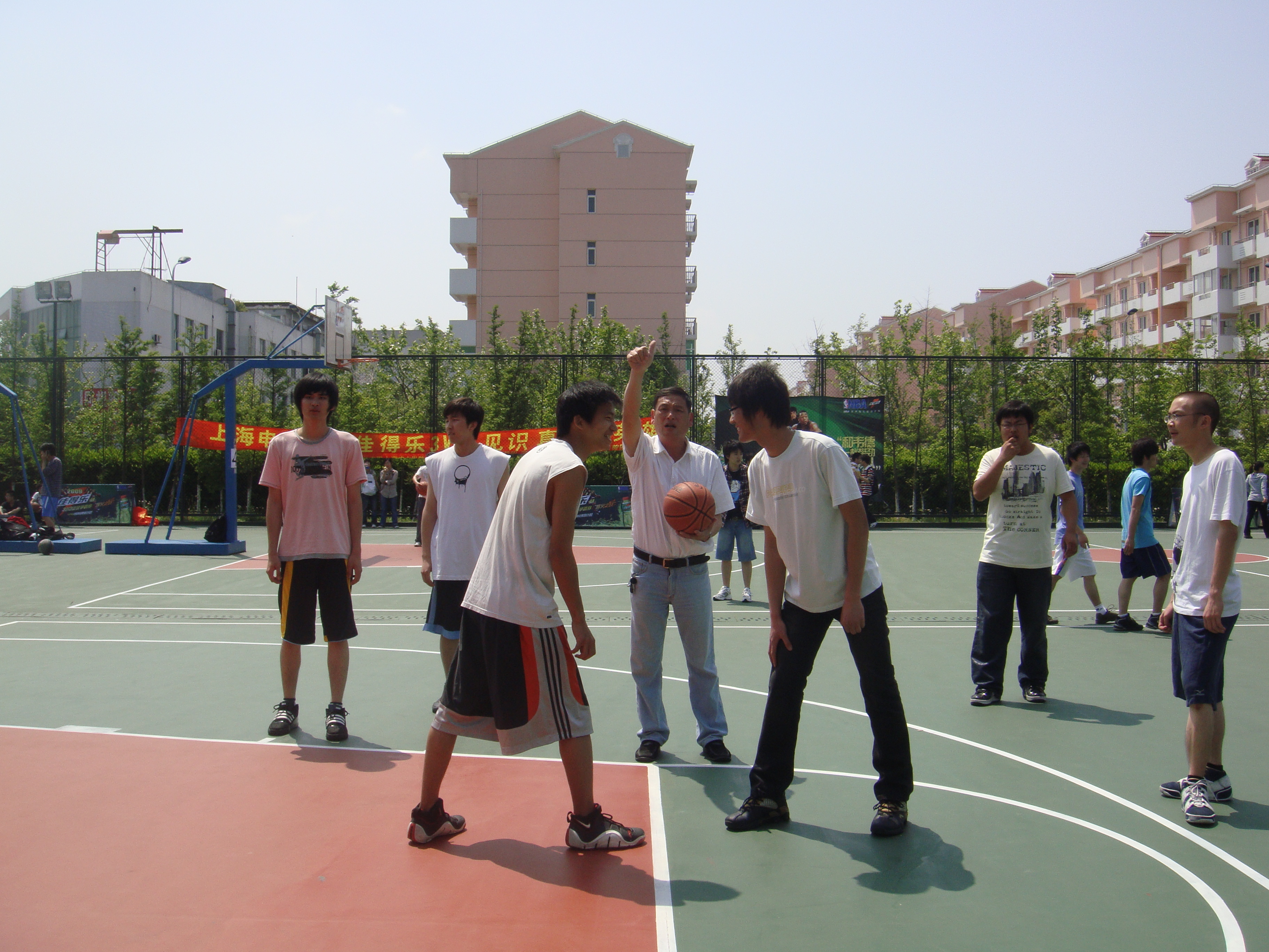 5月5日下午,由校体育部、团委主办,计信公司和《阳光体育与我同行》项目组承办的上海高校“佳得乐”3对3篮球争霸赛在上海电力公司赛区火热开赛。体育部主任胡志麟、书记于善安为参赛队开球。