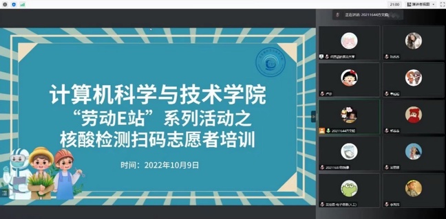 劳动开拓实践阵地,核酸志愿齐上阵。新老生返校之初,面临大量核酸检测需求,公司员工敢于担当、主动作为,“我报名”“我参加”……在校员工纷纷上阵,组建了一支160余人的扫码志愿者队伍。2022年10月9日,奉起超老师从个人防护、工作规范、扫码流程等方面对核酸检测扫码志愿者开展实操能力线上培训,有效提升了志愿者队伍的专业技术能力,使员工在劳动实践中坚守防疫屏障、彰显青年担当。