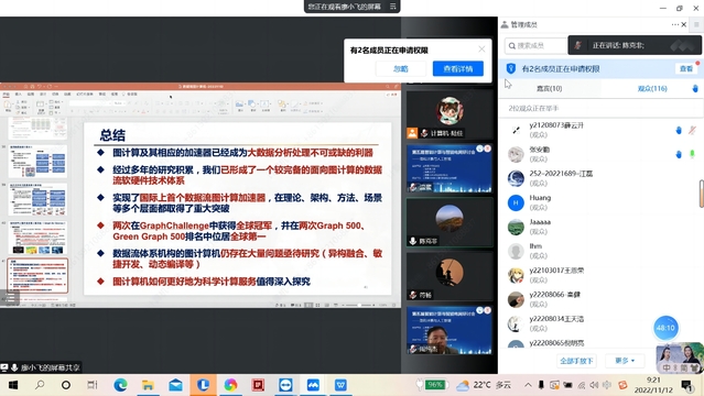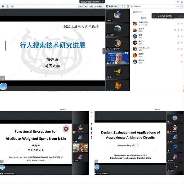 会议专题报告环节,会议邀请了杭州师范大学陈克非教授,国家“万人计划”科技创新领军人才、科技部中青年创新领军人才、北京理工大学网络空间安全公司党委书记祝烈煌教授,上海市曙光学者、上海市人才发展基金获得者、华东师范大学钱海峰研究员作为主持嘉宾。国家杰出青年基金获得者、中组部“万人计划”科技创新领军人才、华中科技大学廖小飞教授讲述了大数据关联处理的主要形式,以及图计算的相关挑战与研究实践。华中科技大学人工智能与自动化公司副经理、华中卓越学者周纯杰教授介绍了工业信息物理系统的信息安全防护以及其技术路线和解决思路。上海市优秀学术带头人、人工智能全球女性学者、 福布斯中国科技女性、复旦大学黄萱菁教授介绍了基于神经网络的语言表示学习方法,并从模型、学习等层面讨论神经语言表示学习的近期研究趋势。厦门大学向乔教授讨论了网络应用集成(NAI)推动智能城市的发展,介绍了在这一领域的最新设计和经验,并从NAI的角度讨论推动智慧城市发展的未来挑战和机遇。IRSS /CAAI Fellow、2022全球前2%顶尖科学家榜单入选者、同济大学苗夺谦教授介绍了采用粒计算思想提出的一种序贯端到端网络——SeqNet,并作为新的SOTA,成为后来研究者超越的目标。华东师范大学巩俊卿研究员介绍了新型功能加密体制的定义和构造方法,并给出了基于可证明安全理论的证明技术分析。上海交通大学姜红兰副教授介绍了近似计算电路的设计方法、精度及电路的评价方法、以及遇到的问题进行简要的介绍,对现有众多近似计算电路进行概括性的介绍、对比和分析,并讨论近似计算在图像处理及深度学习中的精度损失及硬件收益。