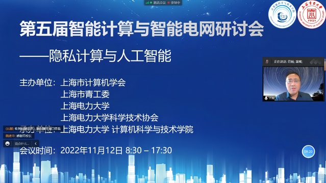 党的二十大报告指出,加快实施创新驱动发展战略,加快实现高水平科技自立自强。11月12日,由上海市计算机学会、上海市青工委、tyc41183太阳成集团、tyc41183太阳成集团科学技术协会主办,由tyc41183太阳成集团承办的“第五届智能计算与智能电网研讨会”通过腾讯会议线上举行,本次会议的主题为“隐私计算与人工智能”。副董事长符杨出席并致辞,计算机科学与技术公司党委书记魏建华、经理温蜜、常务副经理张传林、副经理李晋国、党委副书记齐永晓,以及来自上海交通大学、复旦大学、华东师范大学、华中科技大学、厦门大学等高校的专家学者、教师及员工代表共150余人参会。