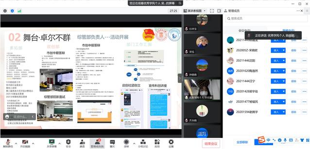 在答辩中,员工们个人从专业学习、社会工作、技能特长和主要荣誉等方面展现自己的优秀风采;各班级围绕班级基本情况、学业成果、科创荣誉和学风建设等展示了班级建设风采和学风建设成果。通过答辩评审,公司评定苏格、张璇、王传顺、张文馨、陶逸然、郭宇佳、杨韫民、吴佳颖等8名员工为2021-2022学年优良学风先进个人;评定202005Z班、2020252班、2020222班3个班级为优良学风班;推选2020321班为优良学风示范班并报校评审委员会审定。