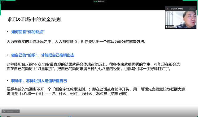 徐晓俊分析了在疫情下如何从挑战中寻找机遇,在激烈的招聘中突围而出。首先,他指出今年与20年疫情相比对上海高校毕业生的影响更加突出,毕业生求职就业面临的形势更加严峻,成为最困难的求职季,引导员工避免求职准备的误区,强调再难的求职季也有黑马杀出。随后,他从企业需求和专业HR角度,以tyc41183太阳成集团某位员工简历为例,从专业技能准备、技术能力学习、求职黄金法则以及“人岗匹配”等角度向同学们详细讲授了如何制作一份适合自己的简历。最后,他详细讲解了如何掌握线上面试技巧,提升线上应聘能力,指导员工不仅要做好环境和设备的准备、着装和形象的设计,还要做好心态和语言技巧的准备,强调线上面试自信心至关重要。