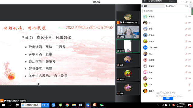新冠病毒的再次变异和快速传播扰乱了我们的日常生活也改变了我们的工作方式。为了提升女教师的防疫抗疫能力、缓解居家隔离压力, 4月26日晚7点,tyc41183太阳成集团工会组织女教师们开展了以“相约云端,同心抗疫”为主题的分享、交流活动。鼓励大家拥抱阳光心态,展示女性风采,丰富居家隔离生活。