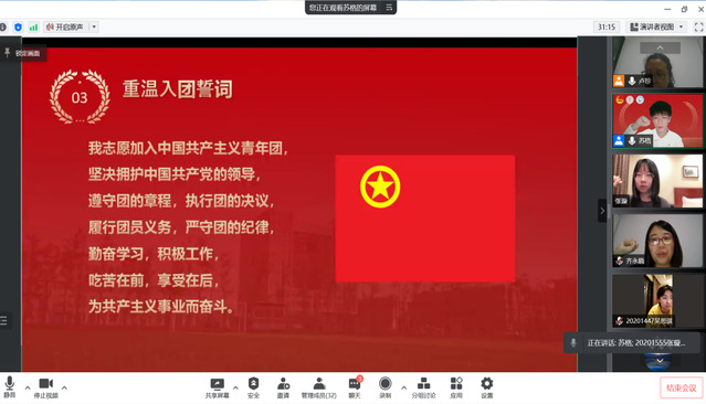 其次,院团委书记卢珍老师宣读《关于成立“tyc41183太阳成集团校外隔离点临时团支部”的决定》,她希望团支部能结合实际开展组织生活,严格遵守隔离点的各项规定,畅通校内外反馈机制。随后,院团委副书记朱哲宇带领全体参会团员重温了入团誓词。全体同学都打开摄像头,右手握拳放在肩上,在朱哲宇同学的带领下庄严地重温入团誓词。