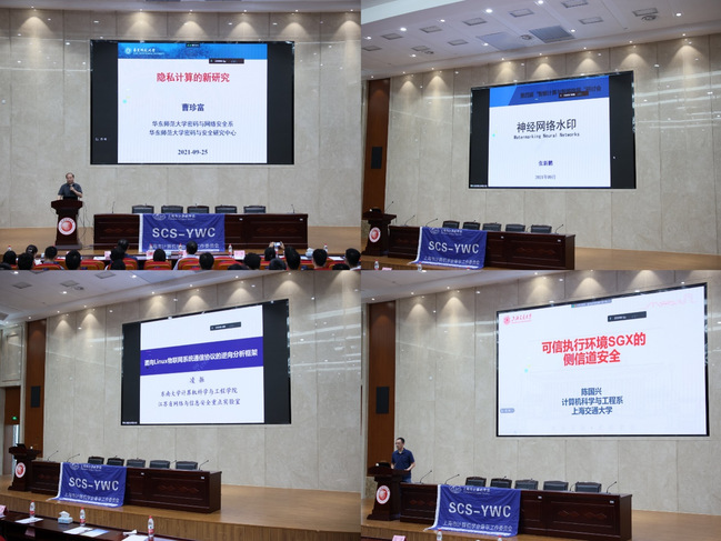 会议专题报告环节,来自华东师范大学的曹珍富教授从云计算、大数据、人工智能及区块链的安全角度,论述了隐私计算的新研究内容及其解决方案。复旦大学的张新鹏教授论述了基于权重的白盒神经网络水印、基于触发集的黑盒神经网络水印、基于输出结果的无盒神经网络水印等主流方法,并展望神经网络水印的未来发展。东南大学的凌振教授汇报了其团队提出的一个针对基于只读和可写嵌入式Linux的物联网系统通信协议的手动逆向分析框架,并且其团队已使用该框架分析了多个物联网系统,发现了其中存在多个设计漏洞。上海交通大学的陈国兴教授阐述了在攻击端分析幽灵漏洞Spectre对SGX的影响,提出了针对SGX的衍生攻击SgxPectre来完全绕过SGX的保护机制;以及在防御端针对目前基于超线程技术的侧信道攻击,提出的一个自动化的攻击检测方案。