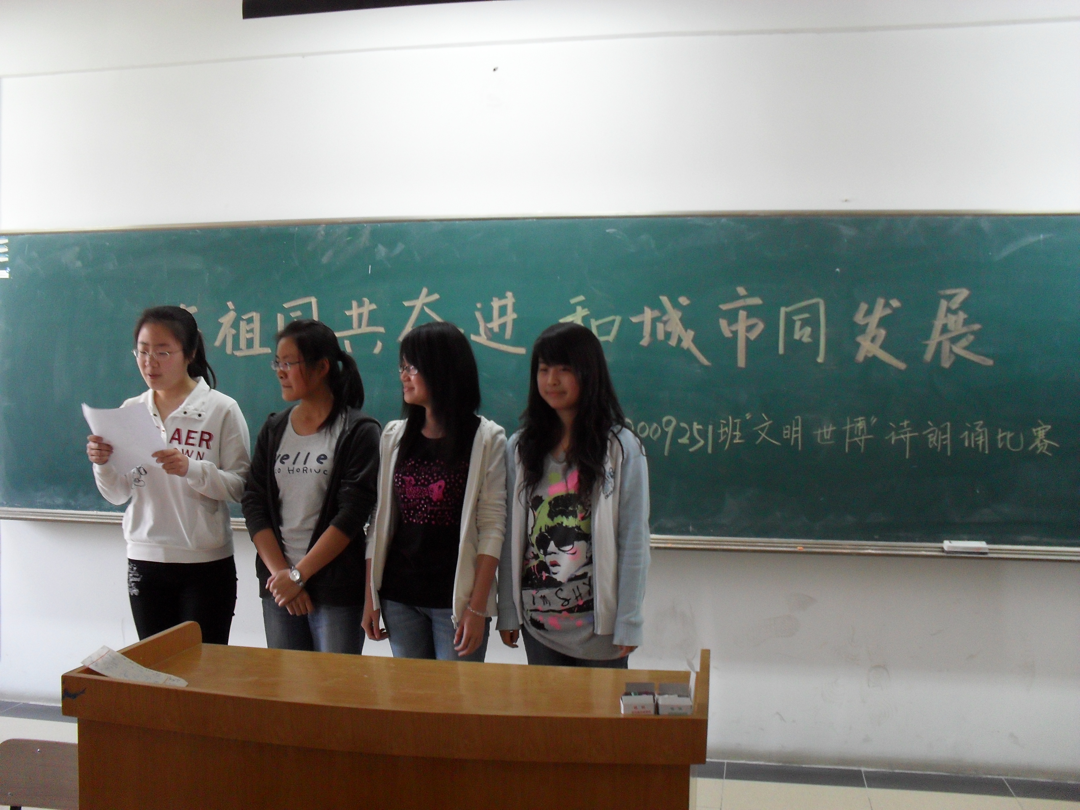 为发扬诗歌文化,宣传世博精神, 近日,2009251班在北1210举行了“文明世博”诗歌朗诵比赛。