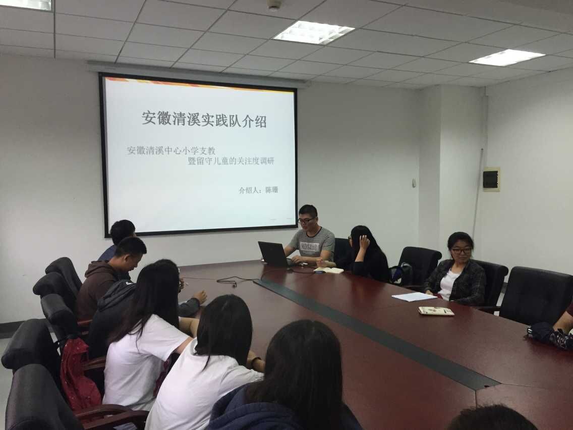 首先由院实践部部长沈聪同学简单介绍了公司的两个暑期社会实践队――安徽清溪实践队和四川达州实践队。安徽清溪实践队由实验室于晓青老师带队,院团委副书记陈珊同学担任队长,陈珊同学介绍其主题为“努力践行社会主义核心价值观,宣扬向上向善精神”,主要实践内容是前往当地进行关于社会留守儿童的关注度的社会调研并且在安徽清溪小学进行支教。四川达州实践队由院团委书记赵铮老师带队,主题为“上电人•达州情”。院员工会主席浦俊俊同学担任队长并且介绍其内容主要有参观电厂,雾霾调研和红色之旅。随后前院员工会副主席高瑛同学作为去年前往安徽清溪实践队的队长传授了一些经验并提供了有效建议。 最后院团委书记赵铮老师强调在实践活动中安全第一的重要性,以及希望同学们多学、多看、多听,将所学应用于实践中。