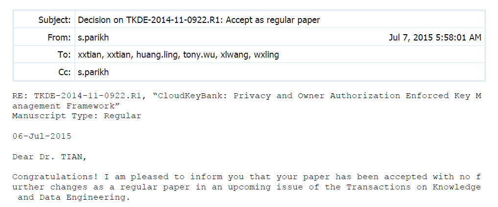 近日,公司田秀霞教授为第一作者的论文“CloudKeyBank: Privacy and Owner Authorization Enforced Key Management Framework”被国际顶级期刊《IEEE Transactions on Knowledge and Data Engineering》 (IEEE TKDE)录用。该期刊创刊于1989年,是知识和数据工程领域中最具影响力的刊物,主要关注知识发现和数据挖掘、数据库和数据建模、并行分布式数据管理系统等领域的最新研究进展和技术。据中国计算机学会推荐国际学术刊物(数据库、数据挖掘与内容检索)显示,该期刊被推荐为A类期刊。