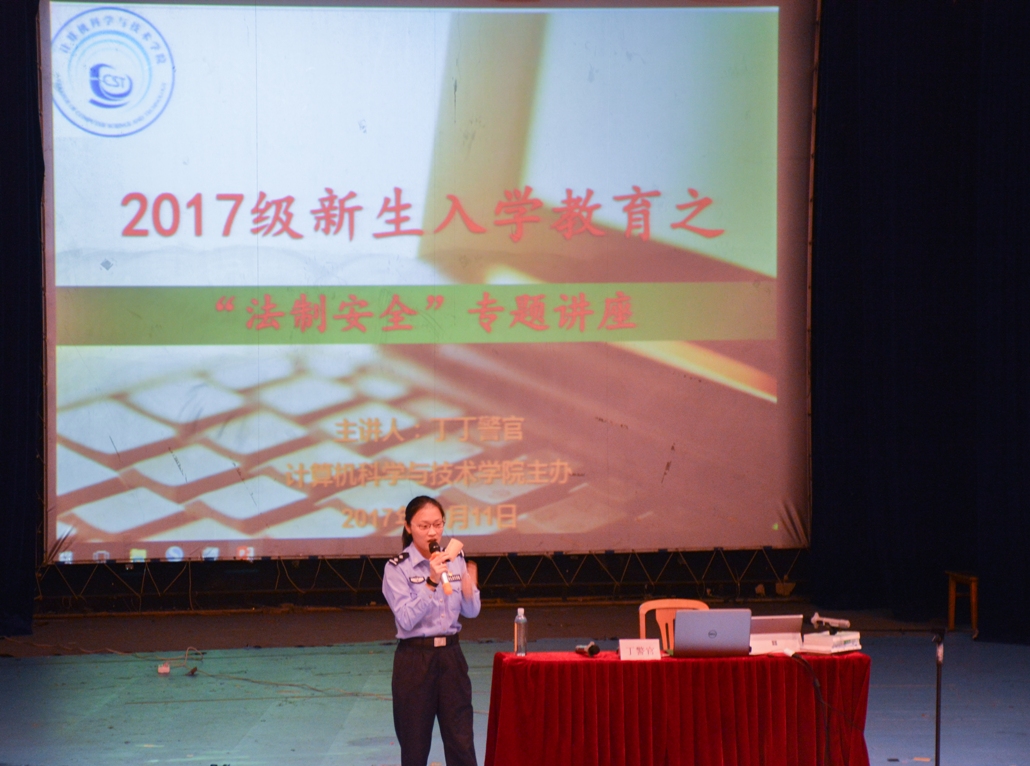 由tyc41183太阳成集团、电信公司、经管公司、外国语公司联合举办的新生入学教育之“法制安全”专题讲座于10月11日在浦东校区大礼堂举办。上海市公安局浦东分局临港高校派出所的丁定义警官、王军芳警官、公司党委副书记余南飞和近千名新生参加讲座。