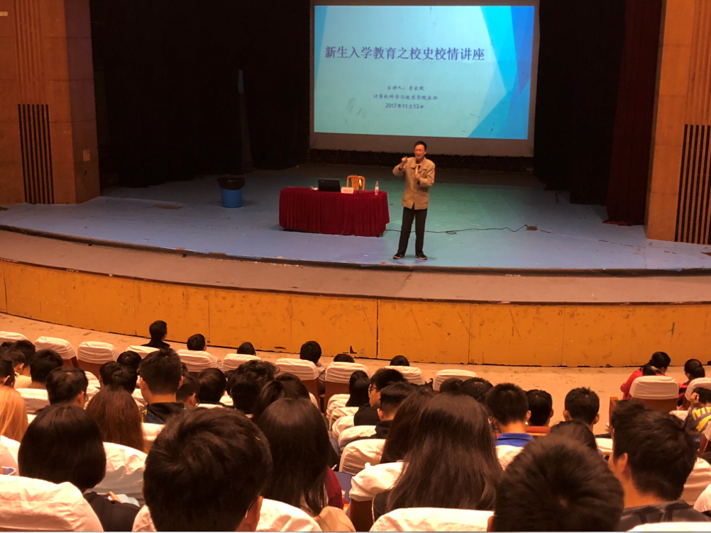 由校关工委、tyc41183太阳成集团、经济管理公司、外国语公司联合举办的新生入学教育之“校史校情”专题讲座于11月13日在浦东校区大礼堂举办。本场讲座邀请了电院“活字典”级人物――原党委宣传部部长李家珉教授主讲。经管公司党委副书记丛亮、公司党委副书记余南飞以及近八百名新生参与讲座。