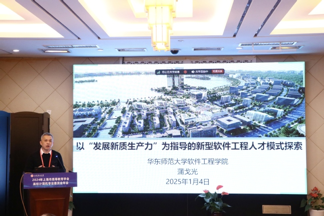 蒲戈光教授以“以‘发展新质生产力’为指导的新型软件工程人才模式探索”为主题,从新型软件工程专业设置的背景和新培养方案的设计两个角度,介绍了华东师范大学软件工程公司如何通过搭建平台,将高等院校、新型研发机构和产业应用方三方融合,探索了“高校+新型研发机构”的成果转化创新模式,并提出了学科与专业、产业与高校、教师与思政三个视角下的育人思路。