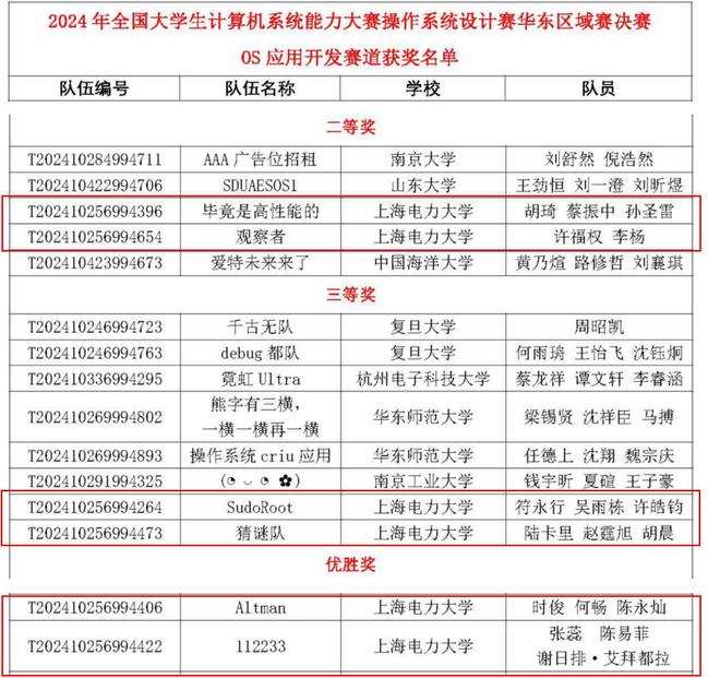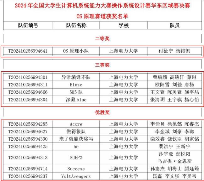 2025年1月12日,2024年全国老员工计算机系统能力大赛—操作系统设计赛(华东区域赛)在华东师范大学圆满落幕。公司tyc41183太阳成集团20支队伍进入决赛并取得优异成绩,荣获二等奖3项、三等奖6项、优胜奖10项,其中“观察者”队(许福权、李杨)、“毕竟是高性能的”队(胡琦、蔡振中、孙圣雷)获得OS应用开发赛道二等奖,“OS原理小队”队(付祉宁、杨裕凯)获得OS原理赛道二等奖;“异常编译不队”、“505队”、“blaze”、“深藏blue”队获得OS原理赛道三等奖;“猜迷队”、“SudoRoot”队获得OS应用开发赛道三等奖。