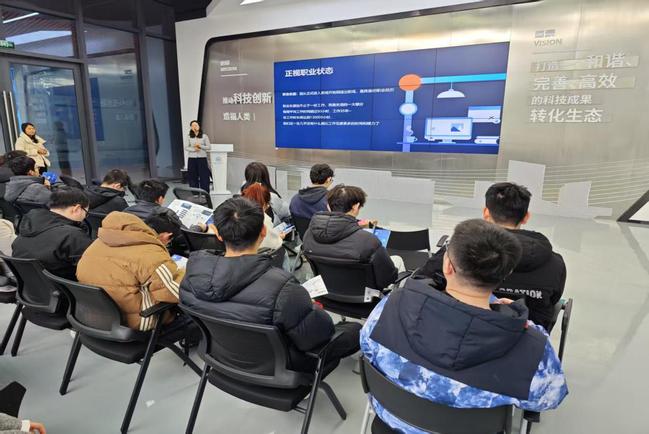 公司人事部经理祝睿带领同学们参观了展厅,对公司的发展历程、主要业务和技术应用进行了详细介绍,并对同学们进行现场教学指导,把理论知识和实际技术应用生产情况相结合,使同学们对工作岗位有更直观深入的了解和认识。参观完展厅后,祝睿经理还与同学们详细分享了职业规划、就业准备、实习生岗位及留任计划、临港新片区人才政策等内容,助力员工明晰未来职业方向。活动现场,员工们积极投递实习简历,展现出浓厚的求职热情。